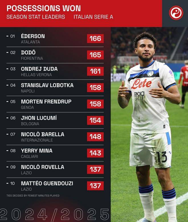 本赛季,他为亚特兰大出场40次,打入5球并贡献1次助攻。在意甲传球进入进攻三区的球员中,埃德松·席尔瓦以440次的传球次数位列第五,而在获得球权次数的统计中,他以166次高居榜首,展现了他攻防一体的全能特质。
